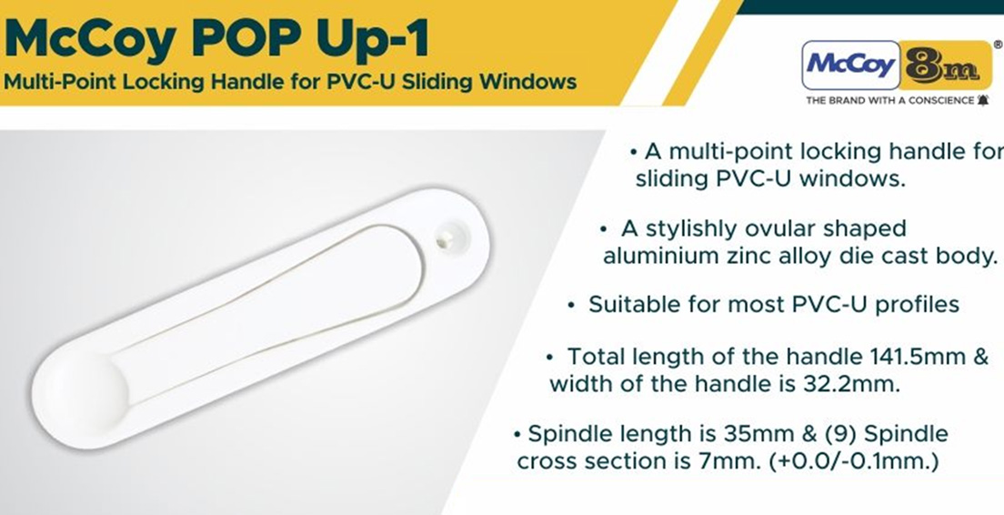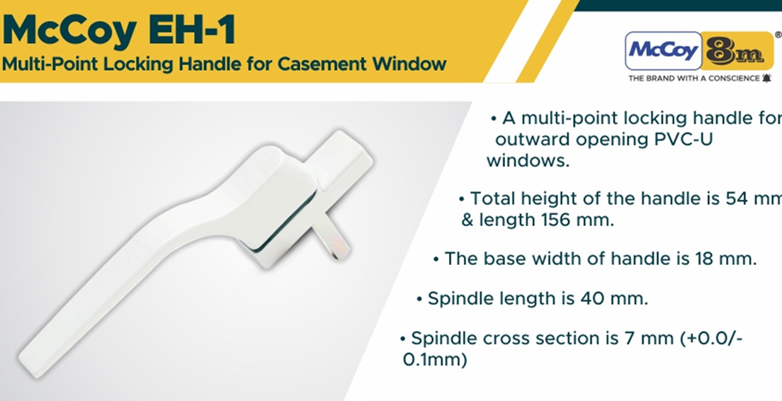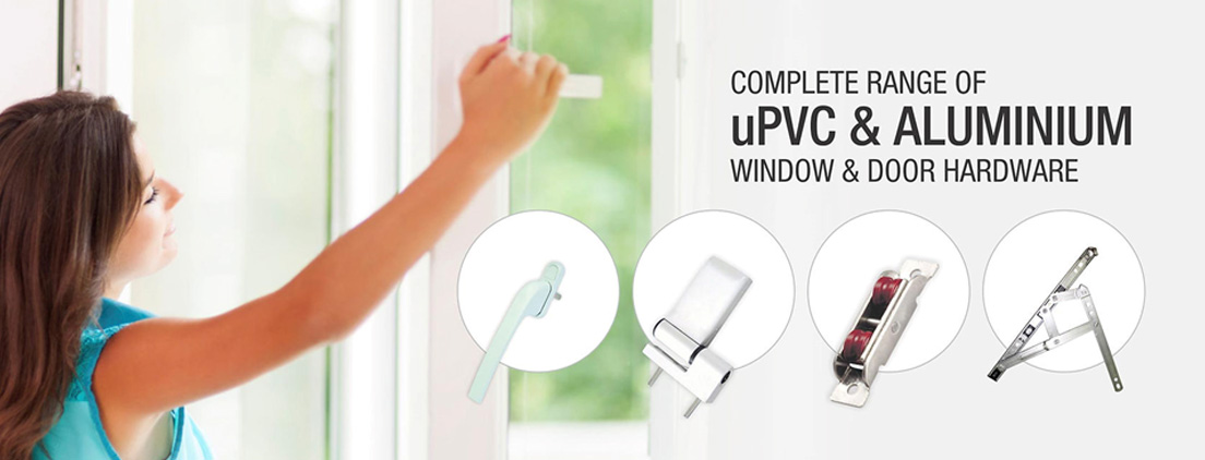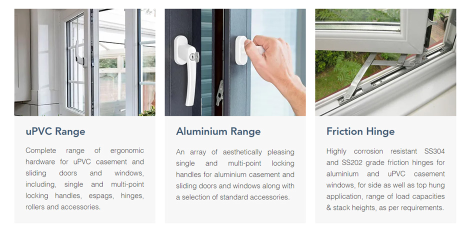 Complete range of ergonomic hardware for uPVC casement and sliding doors and windows, including, single and multi-point locking handles, espags, hinges, rollers and accessories.