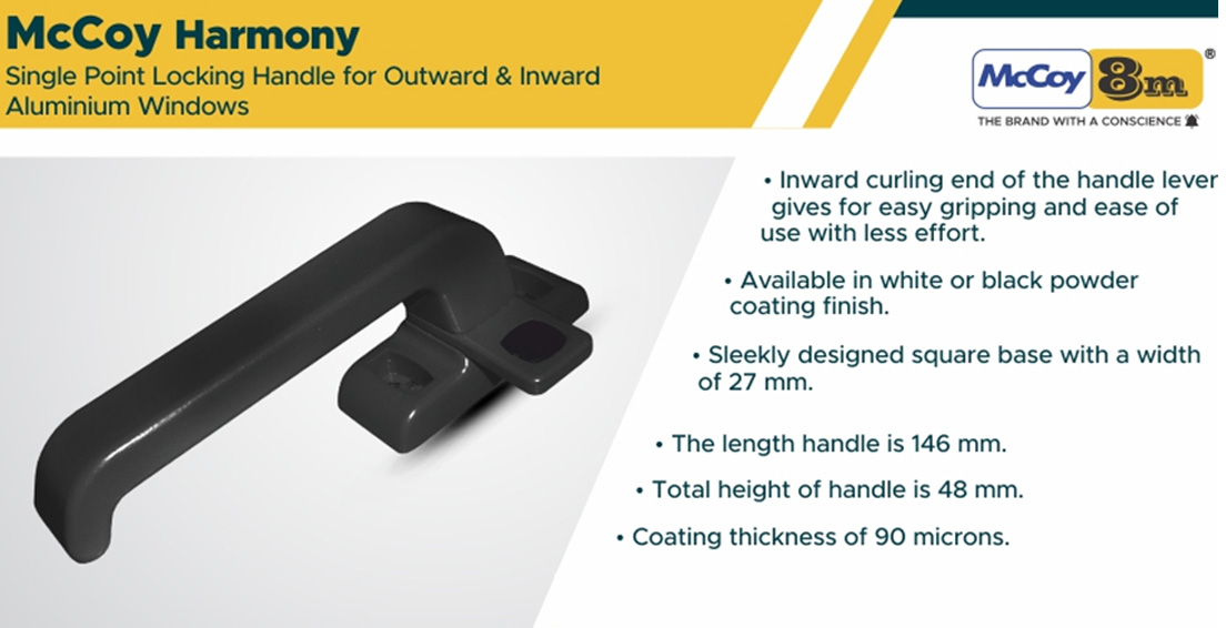 An array of aesthetically pleasing single and multi-point locking handles for aluminium casement and sliding doors and windows along with a selection of standard accessories