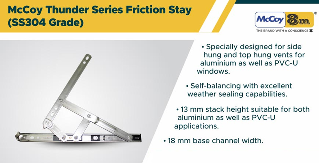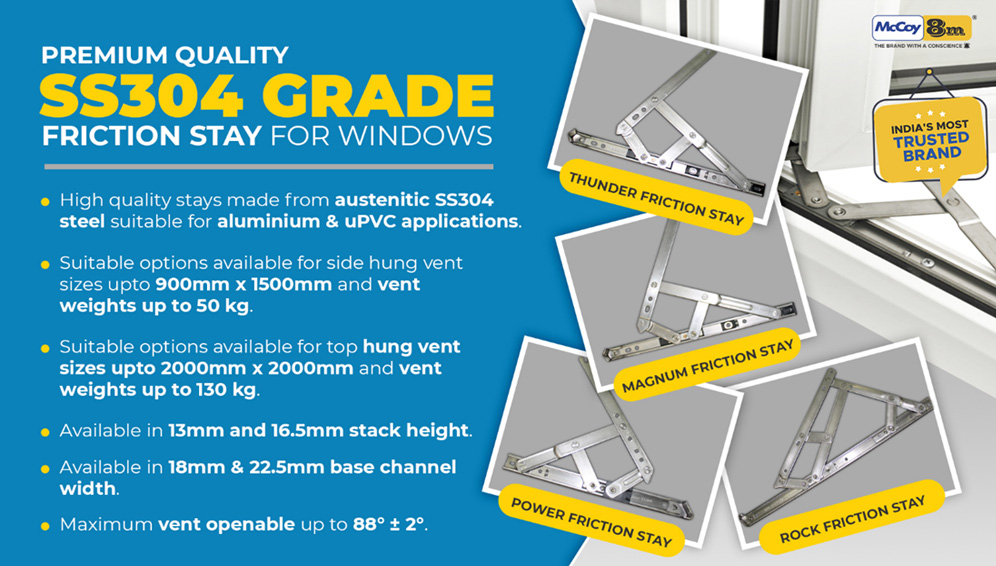 Highly corrosion resistant SS304 and SS202 grade friction hinges for aluminium and uPVC casement windows, for side as well as top hung application, range of load capacities & stack heights, as per requirements